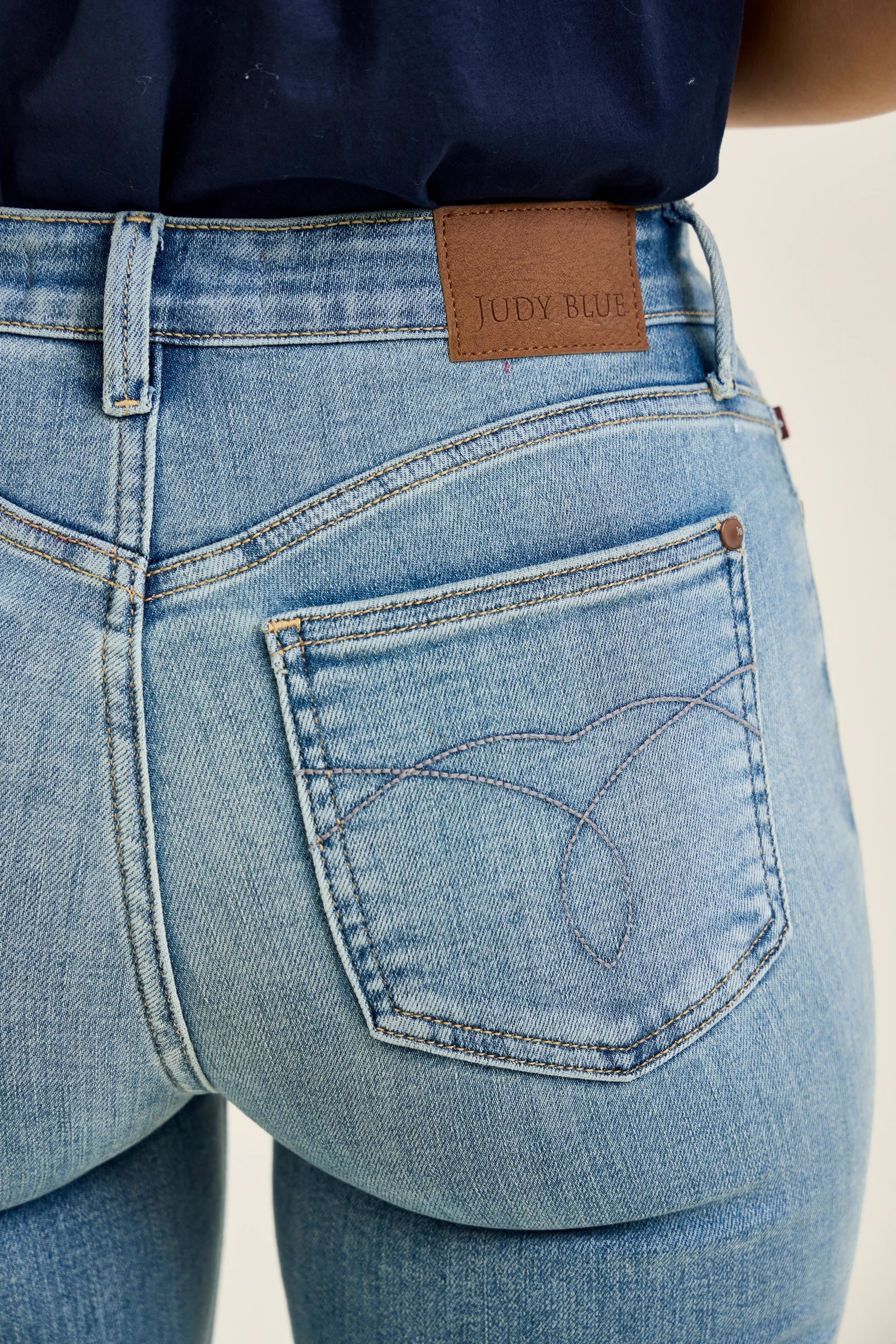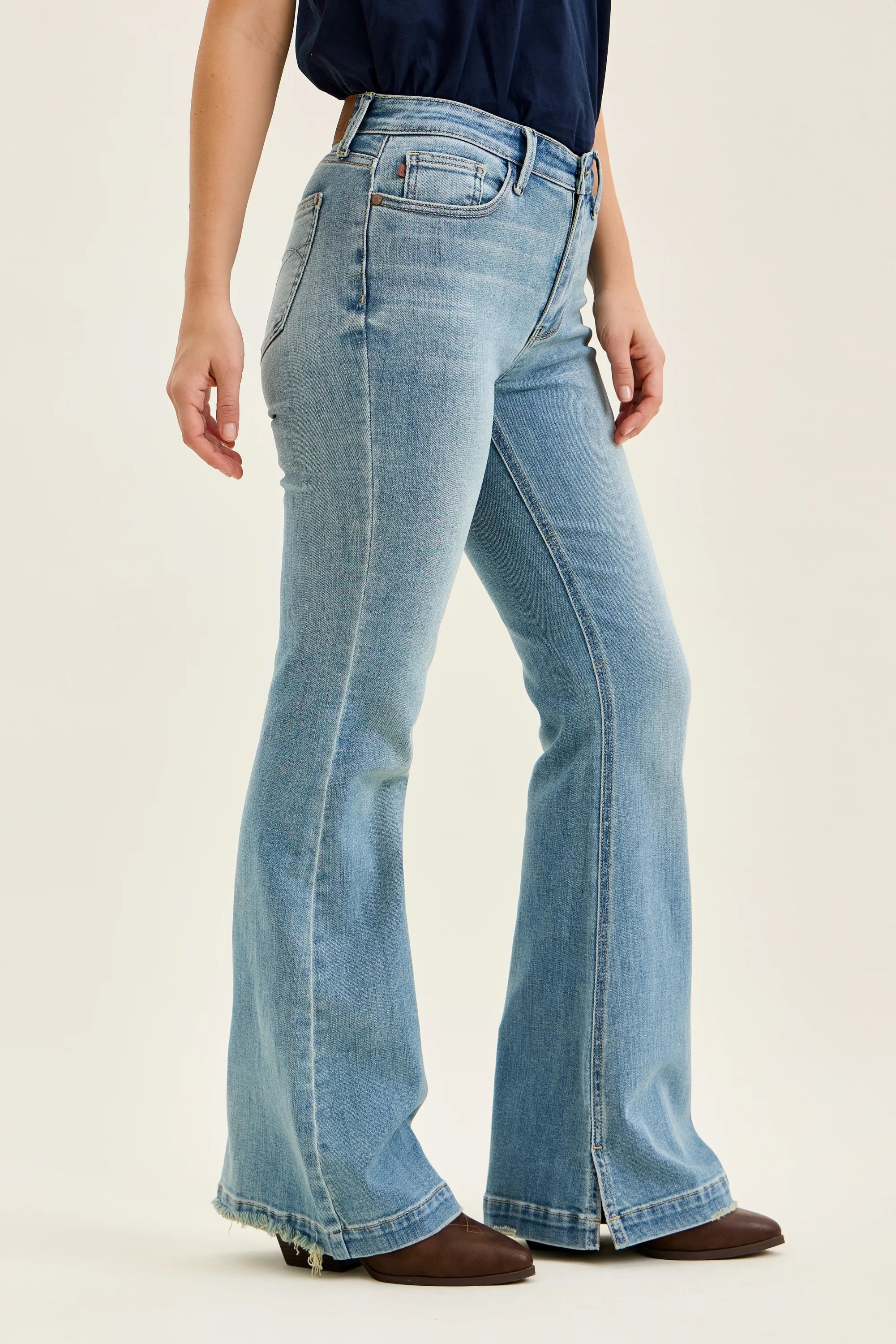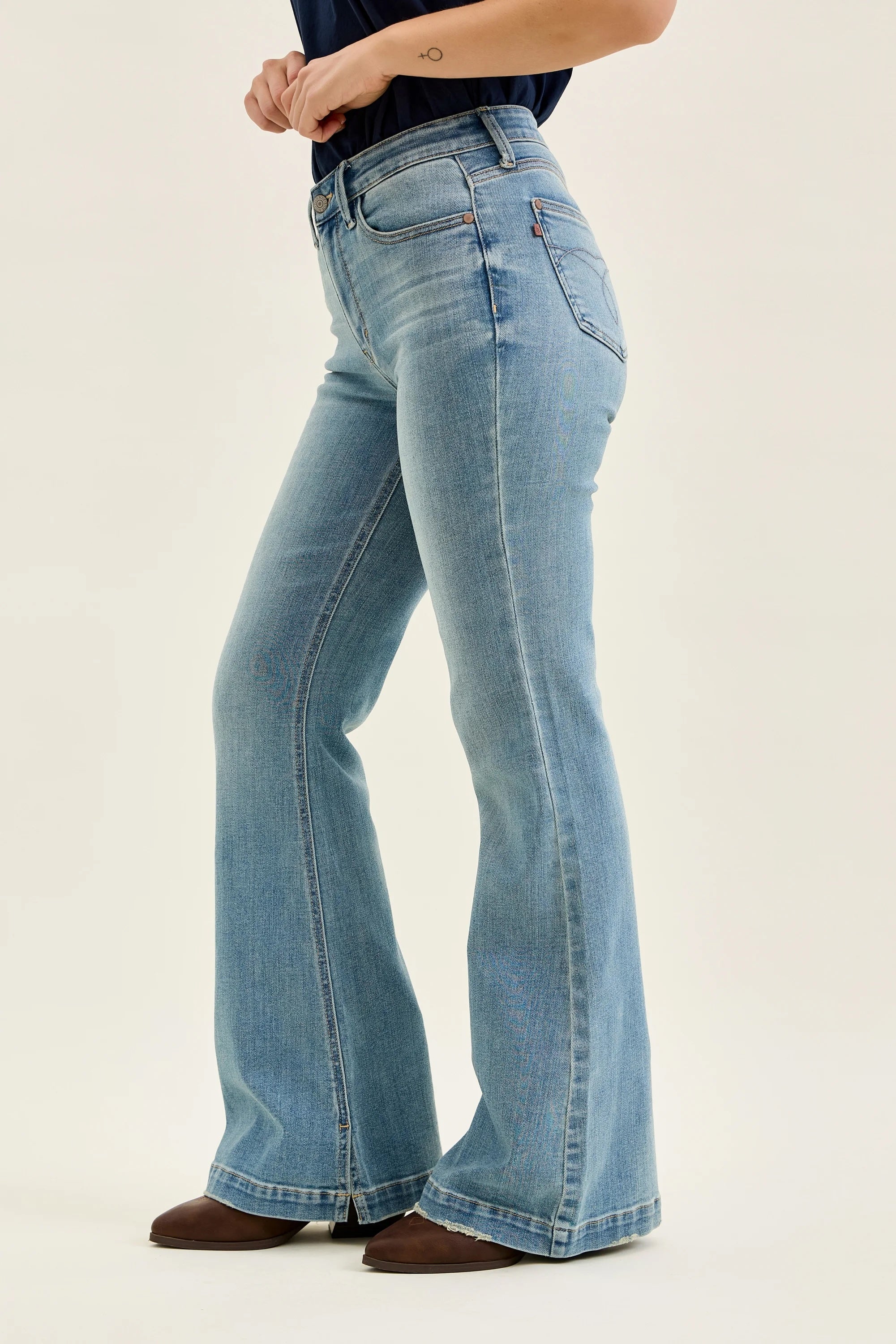 Elevate your denim collection with the Willa Mid Rise Flare. Crafted from signature Judy Blue stretch fabric, this light wash style offers all-day comfort and a flattering silhouette. The mid-rise cut pairs perfectly with the flared leg for a timeless look, while the short inseam ensures an ideal fit for petite frames. Versatile enough for casual outings or dressed-up occasions, this denim staple delivers both style and wearability.