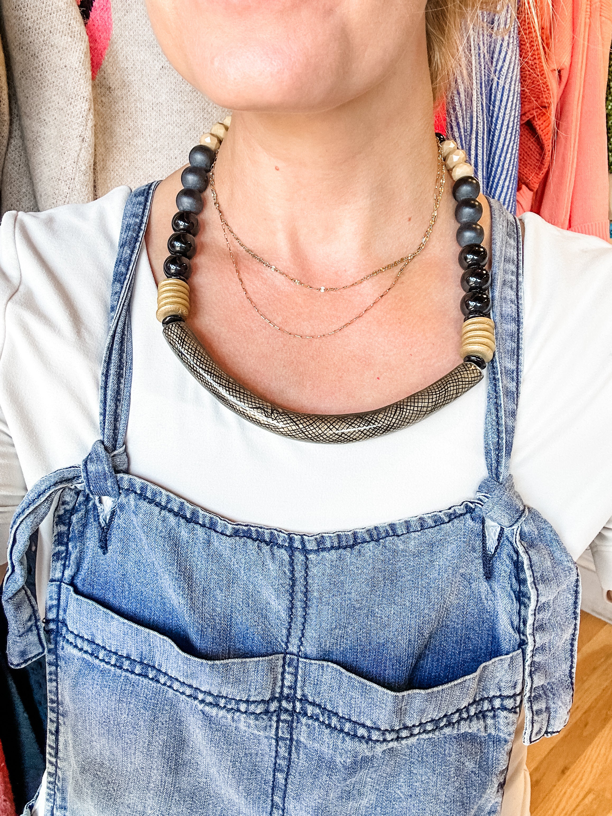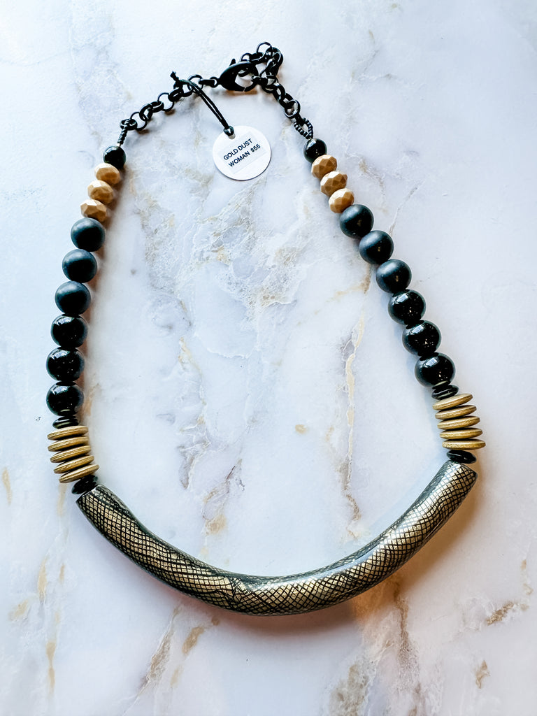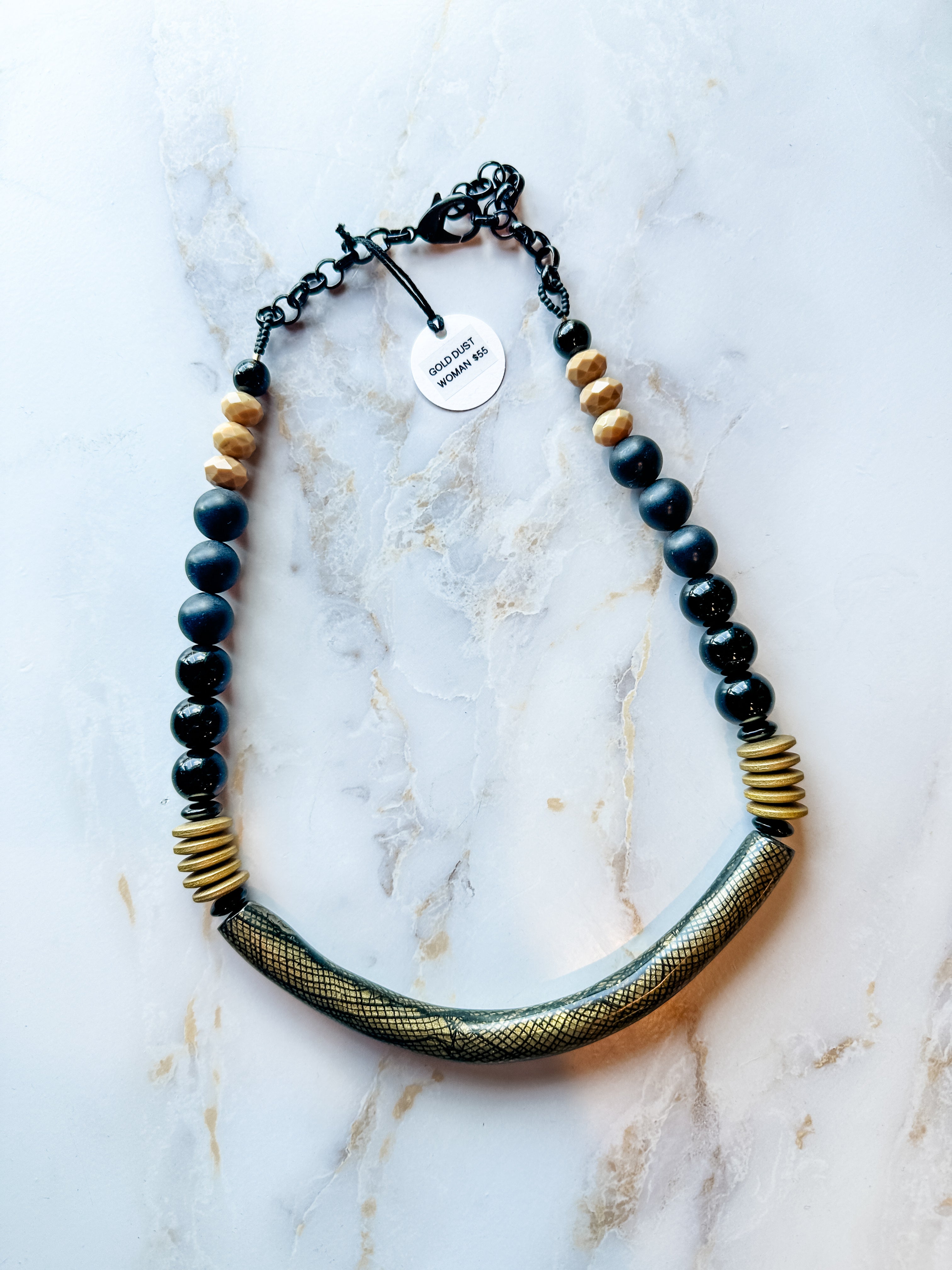 Add a splash of sparkle with this 20-inch Gold Dust Woman Statement Necklace, handmade by Katie at Thought Out Twinkles in Belmont, NC. Featuring a curved gold and black collarbone pendant, it playfully accents your neckline with bold style and a touch of allure. Perfect for turning everyday outfits into eye-catching moments.