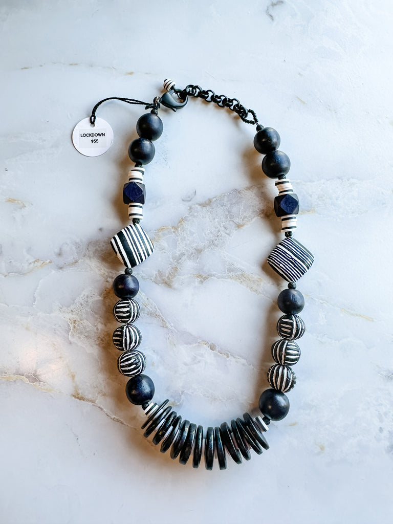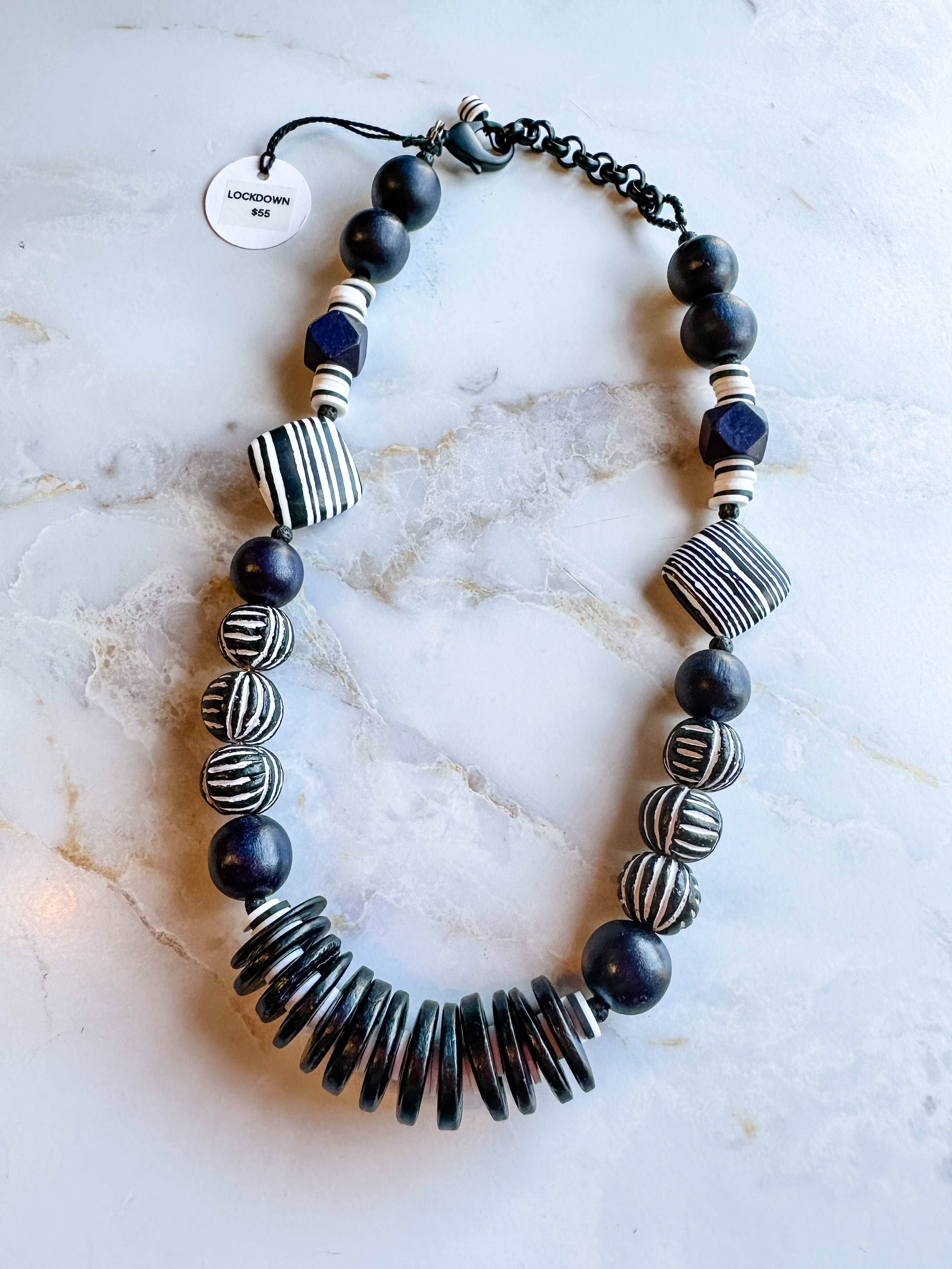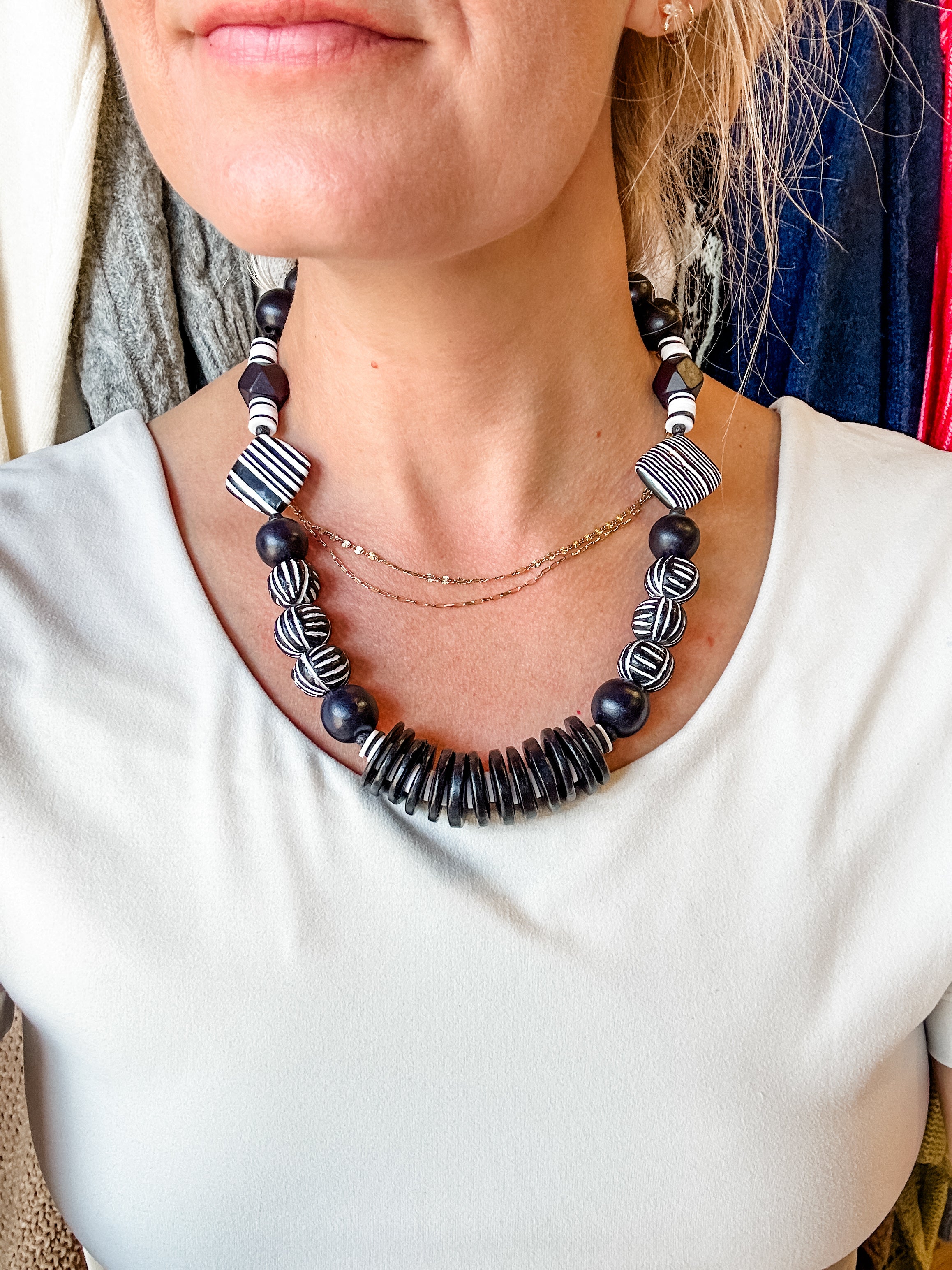 This playful Lockdown Statement Necklace, handmade by Katie at Thought Out Twinkles in Belmont, NC, features chunky black and white carved accent beads. Measuring 18 inches, it rests perfectly at the collarbone, adding a bold yet chic touch to any outfit. Its unique design makes it a fun conversation starter while keeping your style effortlessly fresh.