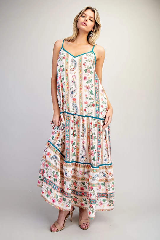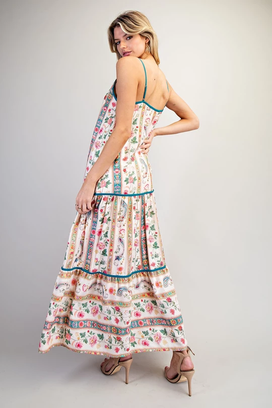 Twirl into the spotlight in this breezy maxi dress that's equal parts whimsy and sophistication. Featuring a stunning white floral paisley print, adjustable spaghetti straps keep you comfortable all day long, while contrast piping adds a sharp, polished edge. The tiered skirt creates gorgeous movement with every step, and a full lining ensures you're covered and confident. Perfect for garden parties, casual dates, or whenever you need a dress that does the talking for you.