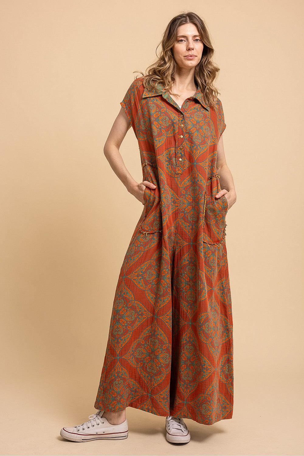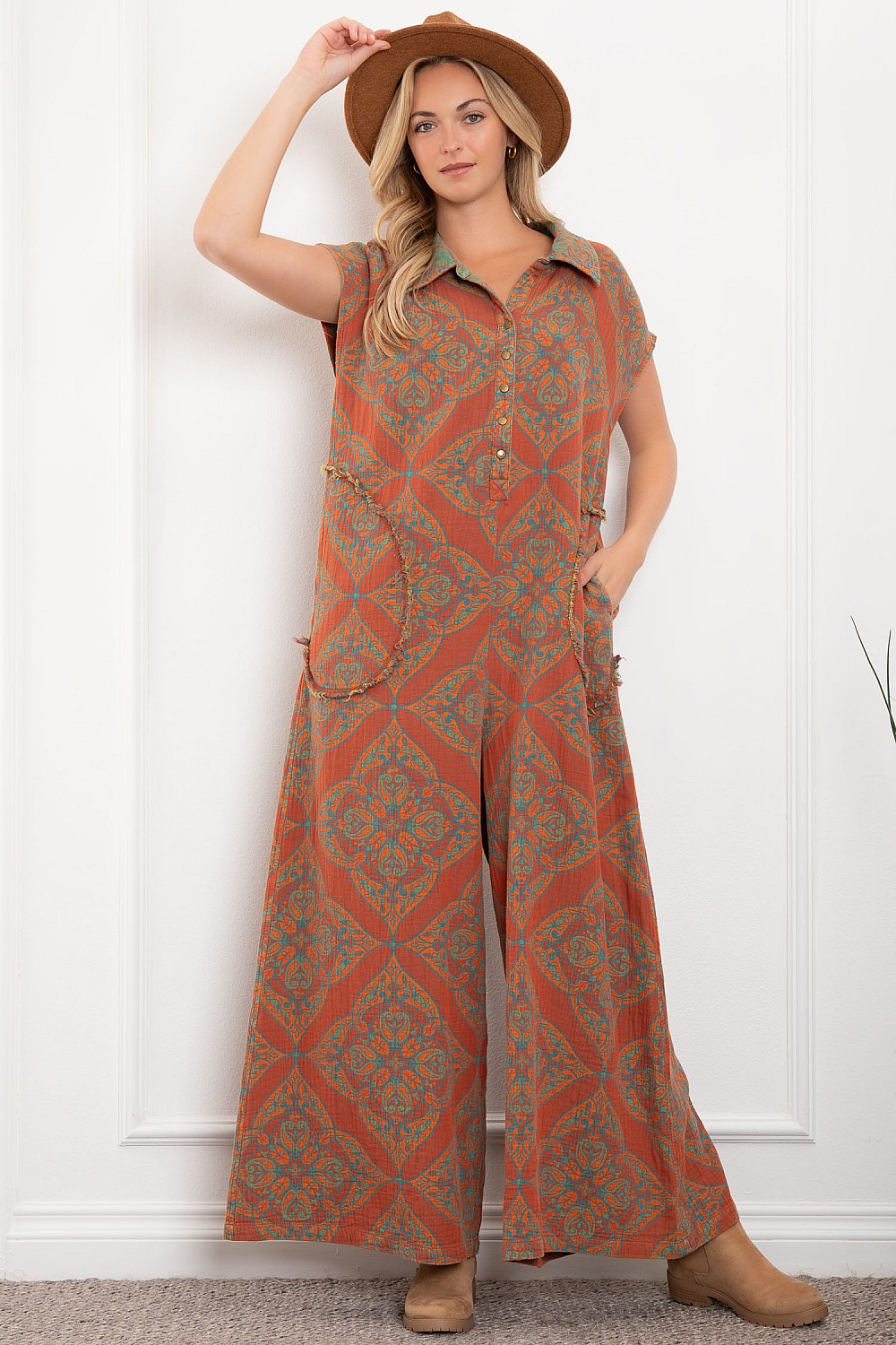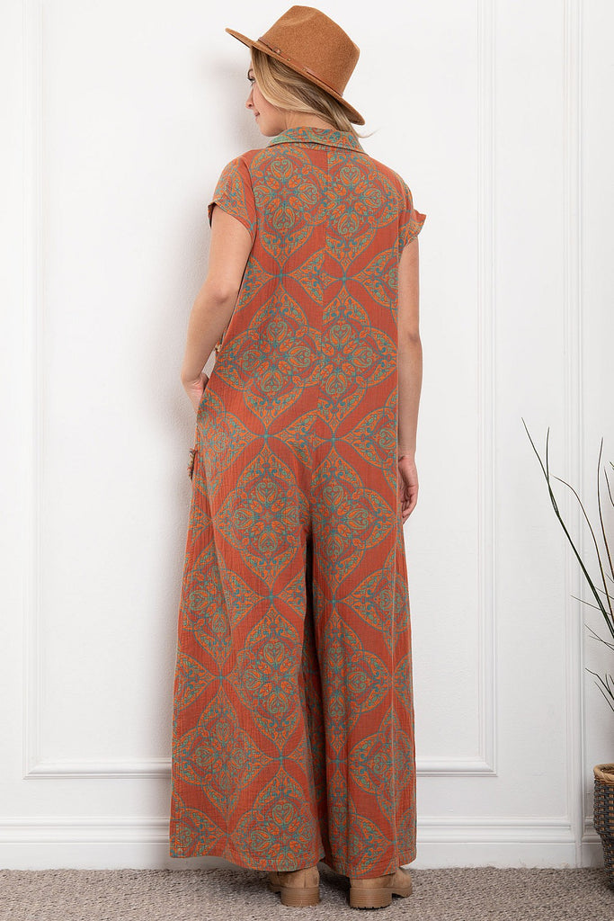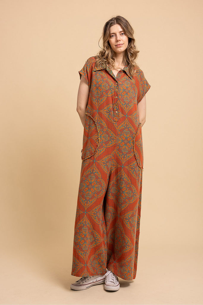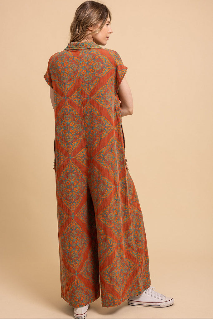 Stay stylish and comfortable this fall with our Autumn Days Sleeveless Baggy Jumpsuit! Made of lightweight cotton gauze fabric, this jumpsuit features a fun orange and teal print and convenient pockets. No waistband means ultimate flexibility and comfort. Perfect for those who want to look chic without sacrificing comfort. Reversible styling means you can wear it two ways!