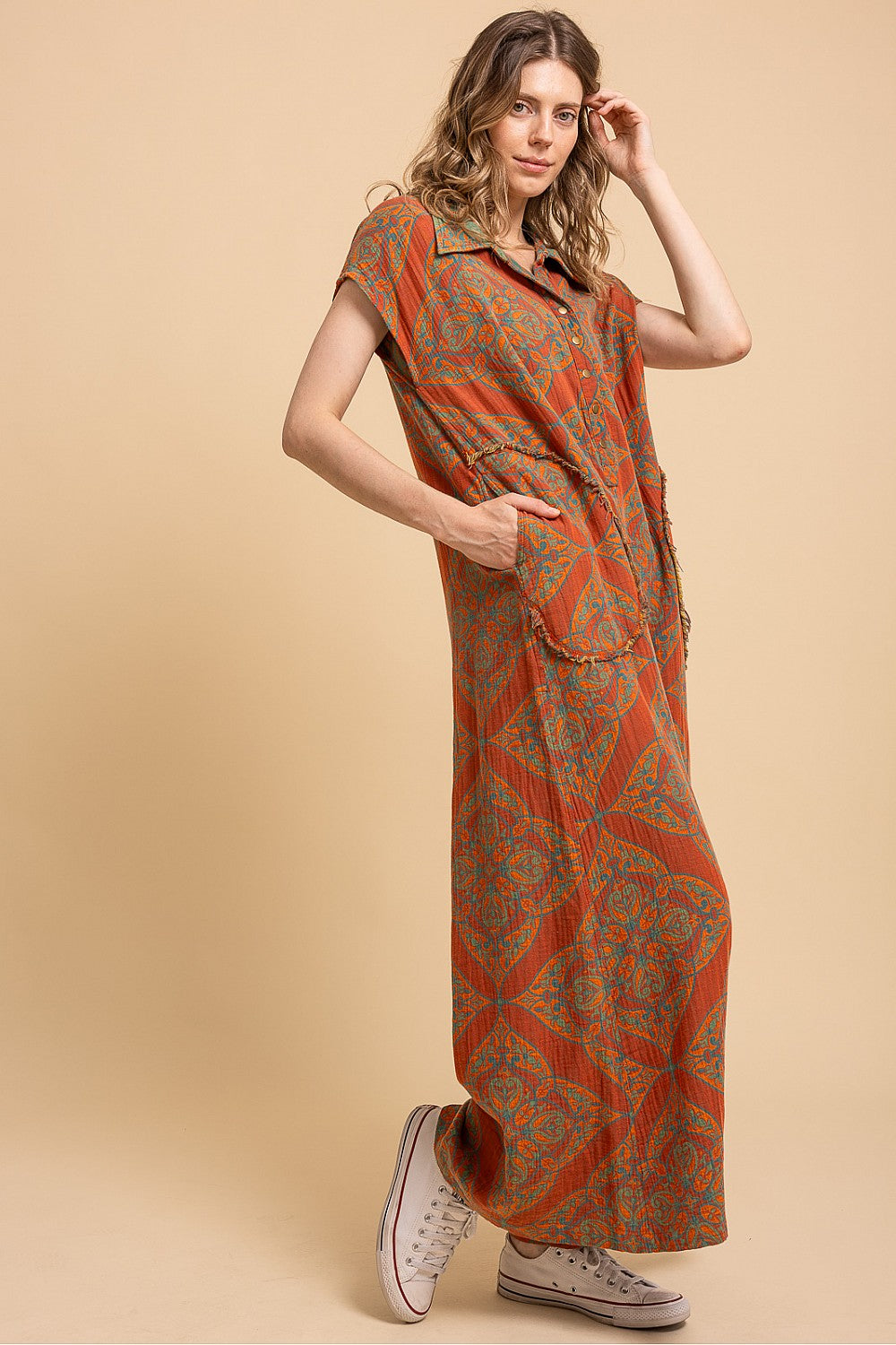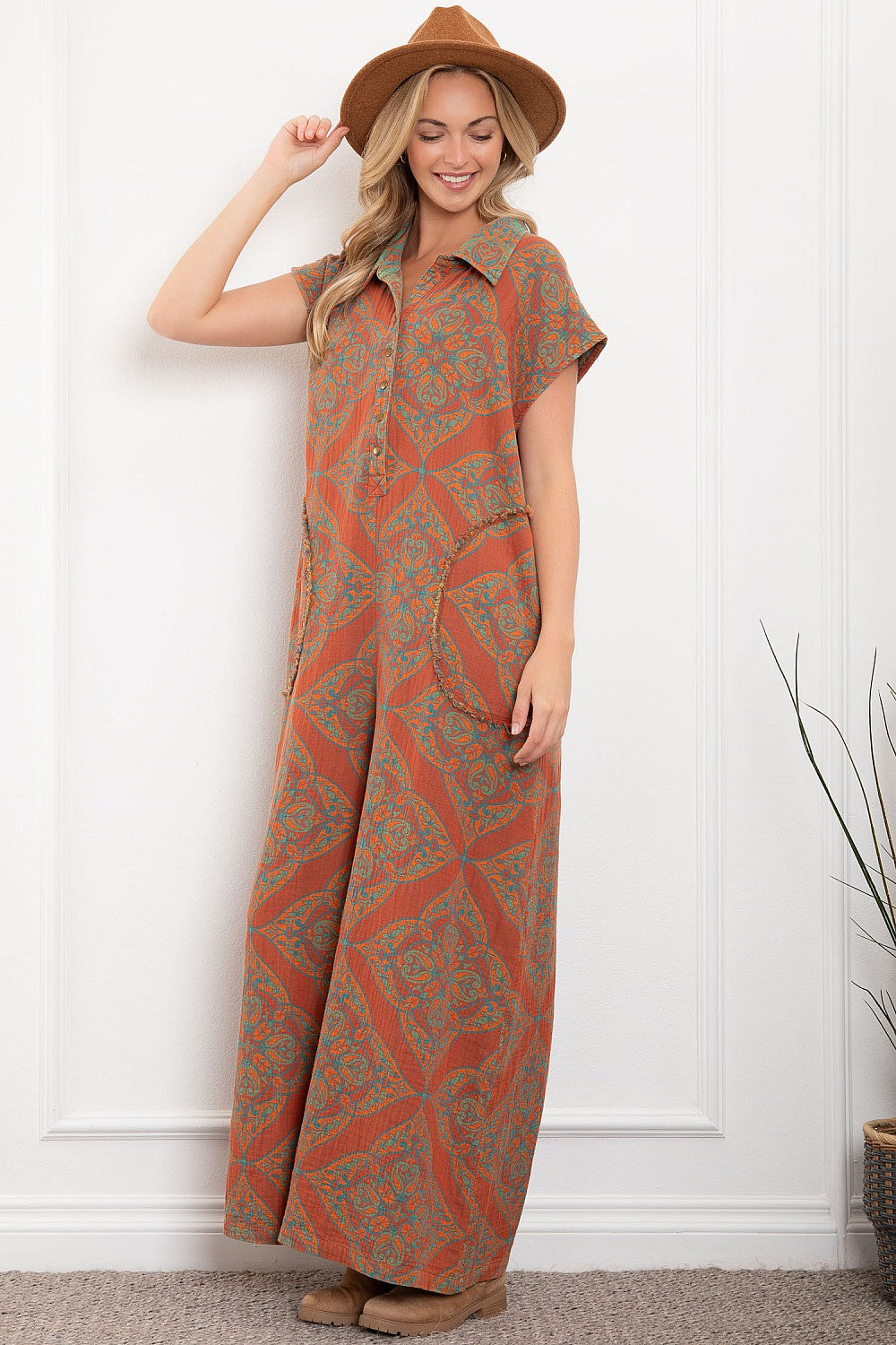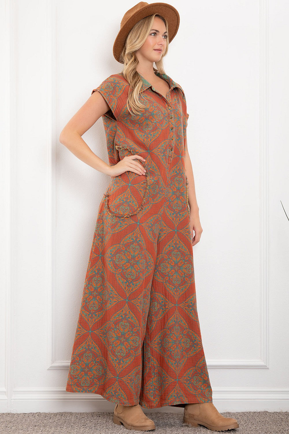 Stay stylish and comfortable this fall with our Autumn Days Sleeveless Baggy Jumpsuit! Made of lightweight cotton gauze fabric, this jumpsuit features a fun orange and teal print and convenient pockets. No waistband means ultimate flexibility and comfort. Perfect for those who want to look chic without sacrificing comfort. Reversible styling means you can wear it two ways!