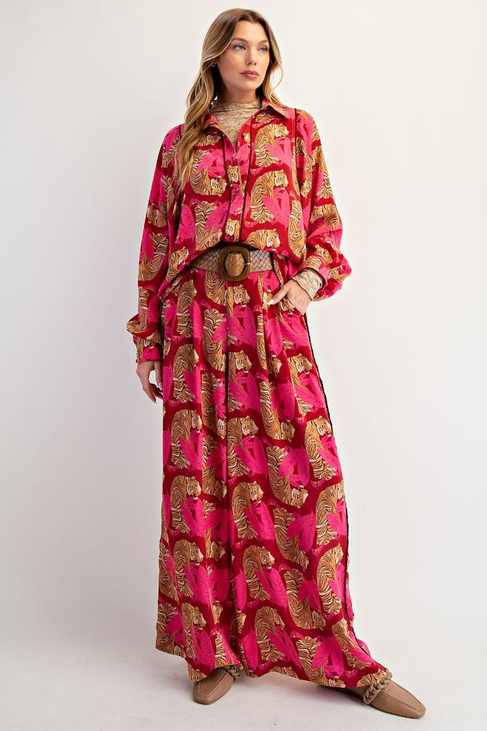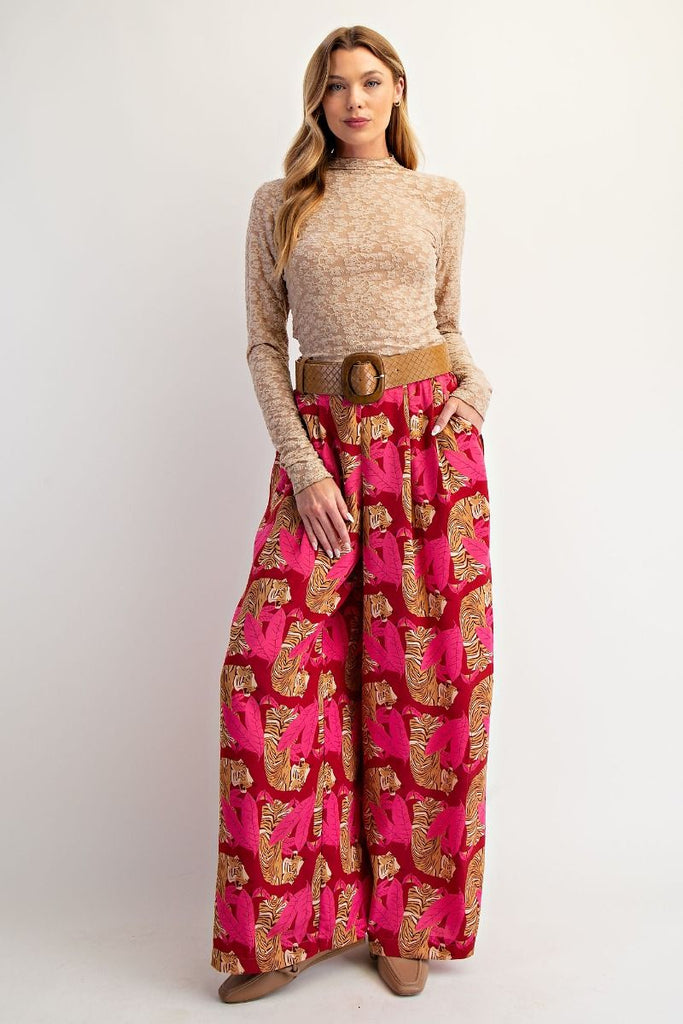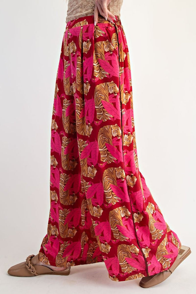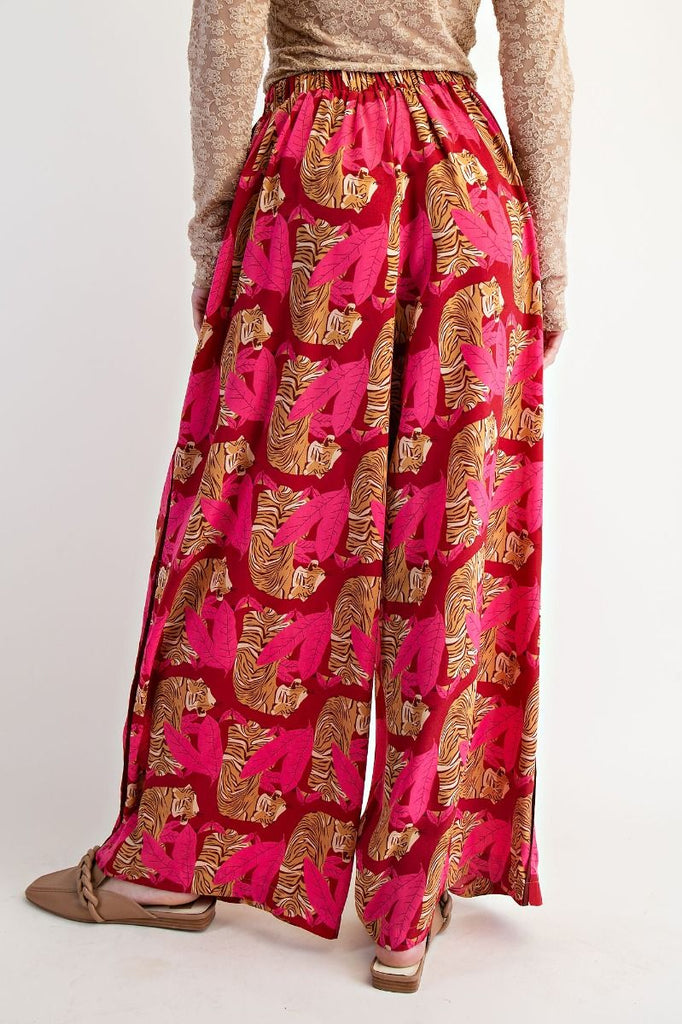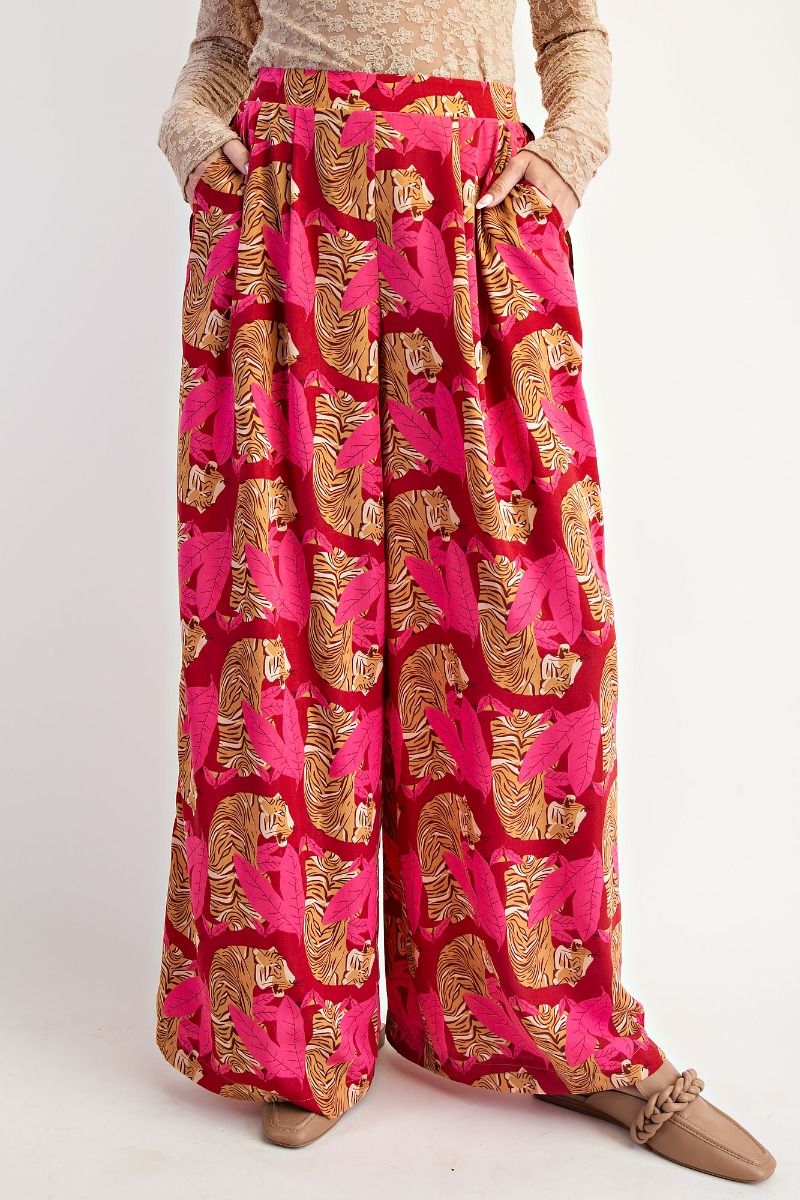 Embrace bold comfort with the Pink Tiger Club Pant, featuring a playful tiger and leaf print in warm peach tones. These high-rise pants offer a wide-leg, flowy fit that moves with you, perfect for lounging or stepping out in style. Full-length with handy side pockets, they combine practicality with eye-catching design. Small size measurements include a 41" outseam and a 13.5" waist, ensuring a flattering silhouette that’s as fun as it is comfortable. Pair with the matching set to complete your look!