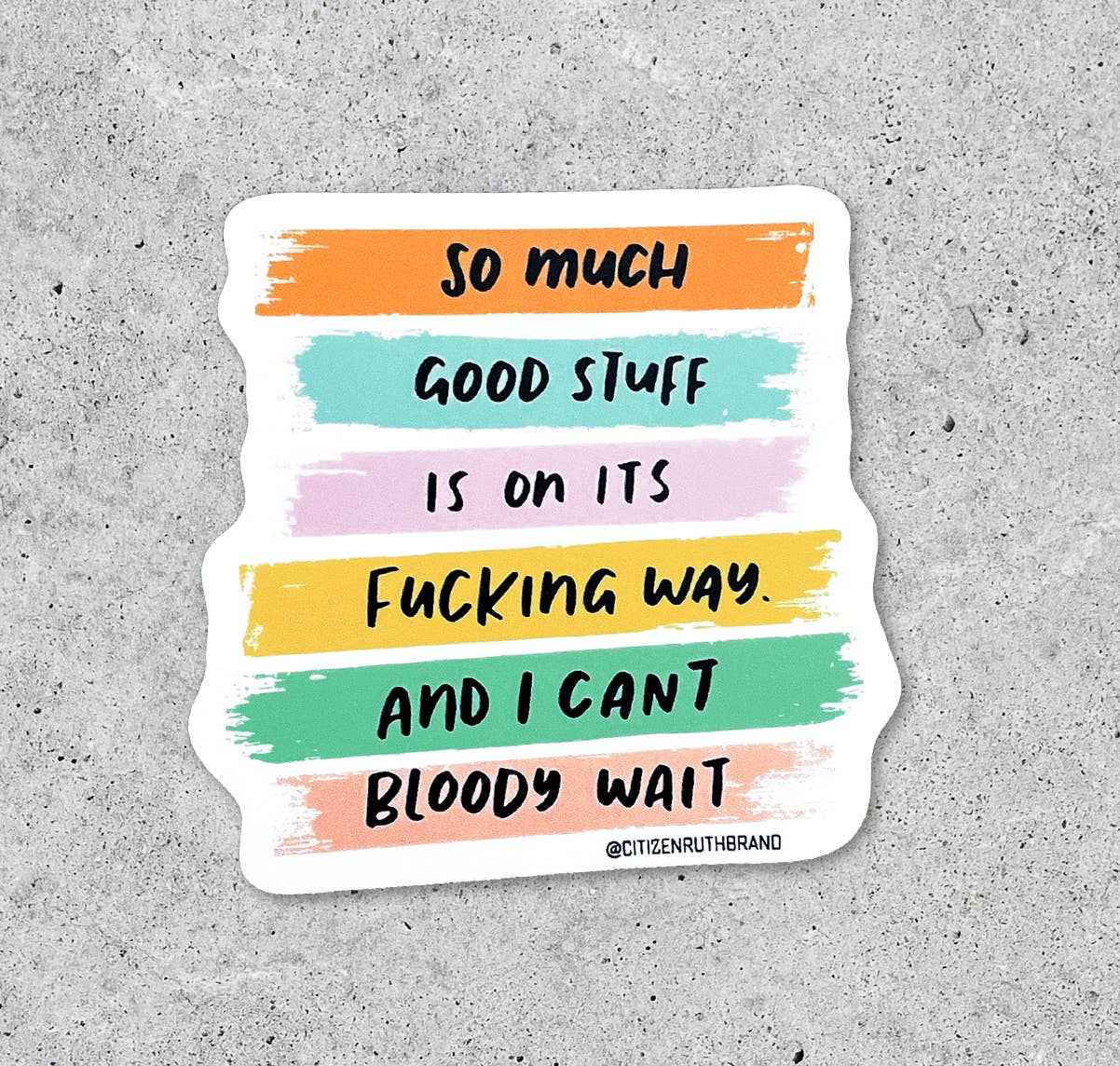 One of our bestselling new designs from artist Stacie Lee from Peachy Rebel. This is really taking the positive affirmations to the next level. Sticker reads, So much good stuff is on its fucking way and I can't bloody wait."