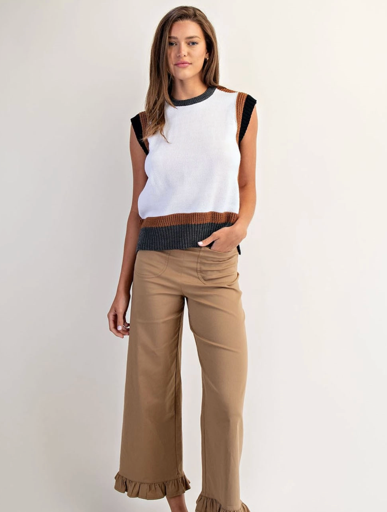 Layer up with effortless style in this color-blocked knit top featuring crisp white, warm camel, and cool gray panels. The sleeveless design keeps things breezy while the structured knit offers just the right amount of polish for casual days or dressed-up moments. Mix-and-match friendly, this modern essential pairs with everything in your closet.