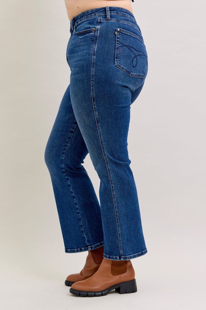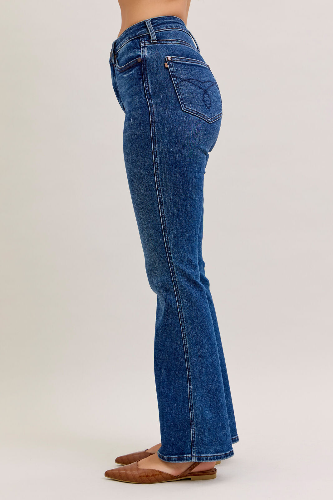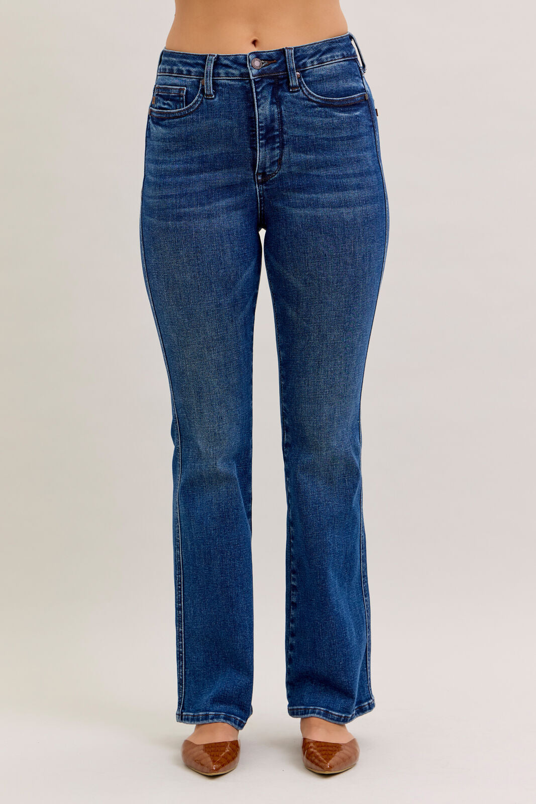 Get ready to rock the classic look with Karsen Short Inseam High Rise Bootcut jeans by Judy Blue! The high rise design and signature stretch material provide the perfect fit, while the tummy control panel helps you feel confident all day. Complete with a flattering boot cut leg and a sleek dark wash, these jeans are a must-have for any wardrobe.