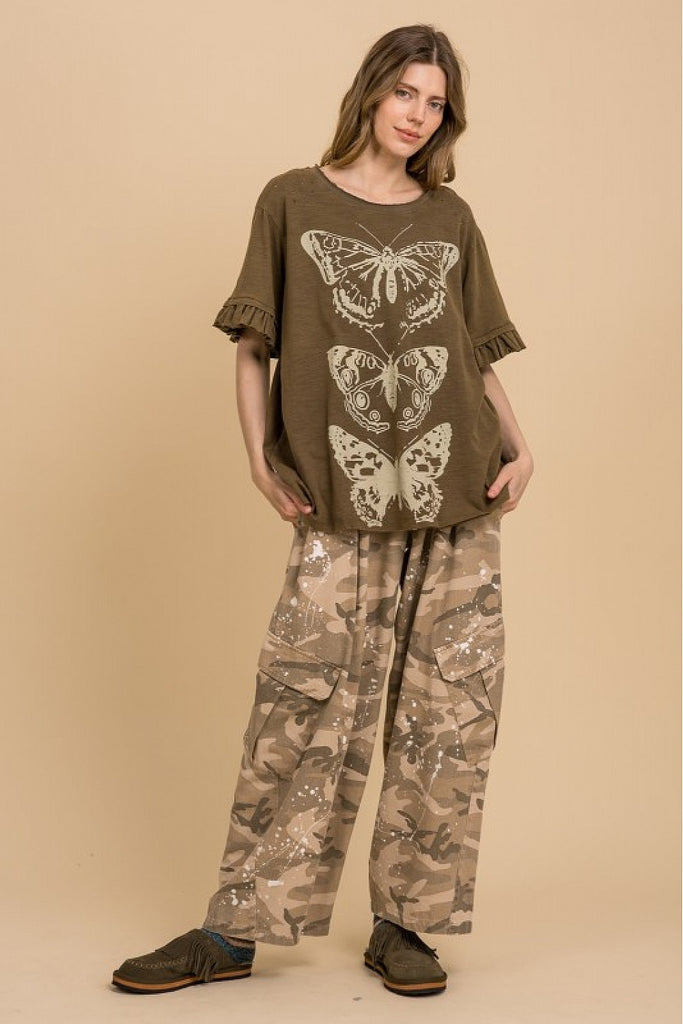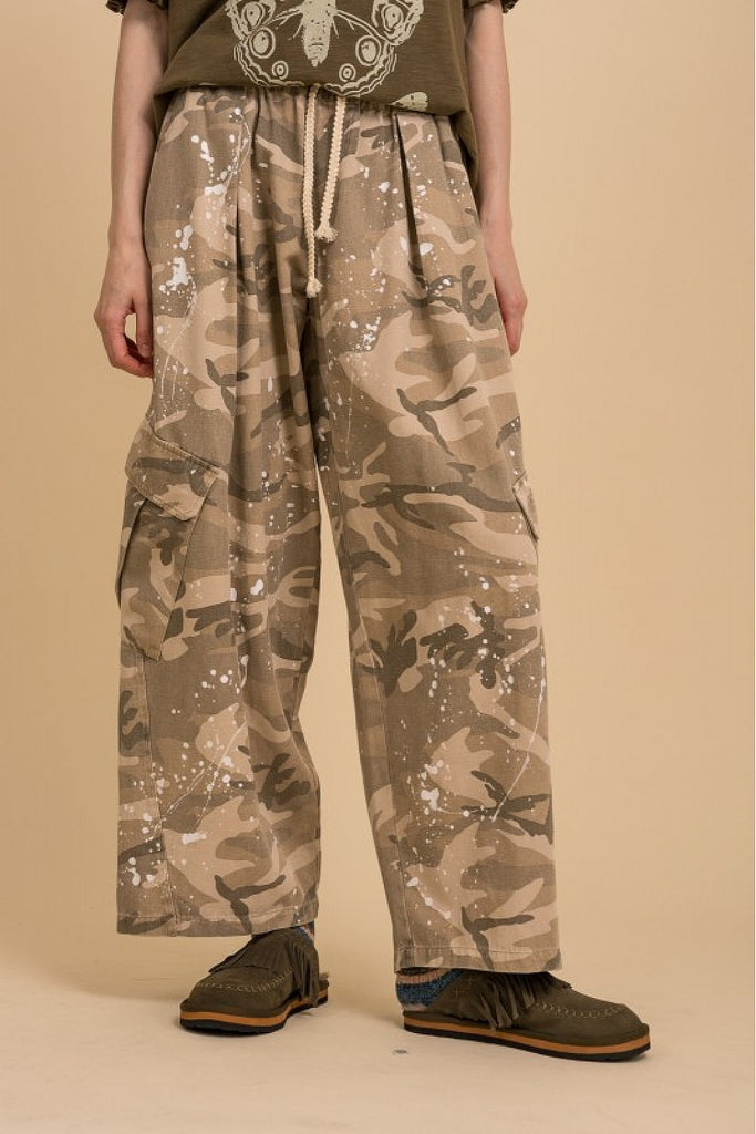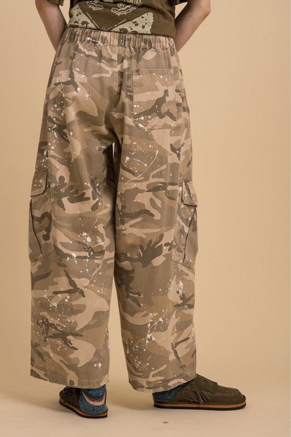 Rock a laid-back vibe with these camouflage cargo pants that blend comfort and edge. Featuring a relaxed baggy fit with an elastic waistband and drawstring for easy adjustability, they're designed for all-day wear. Side pockets keep your essentials close, while the paint splatter detailing adds artistic flair. Made from 100% cotton with a garment-washed finish for that perfectly worn-in feel. Full-length cut that works with everything from sneakers to boots.