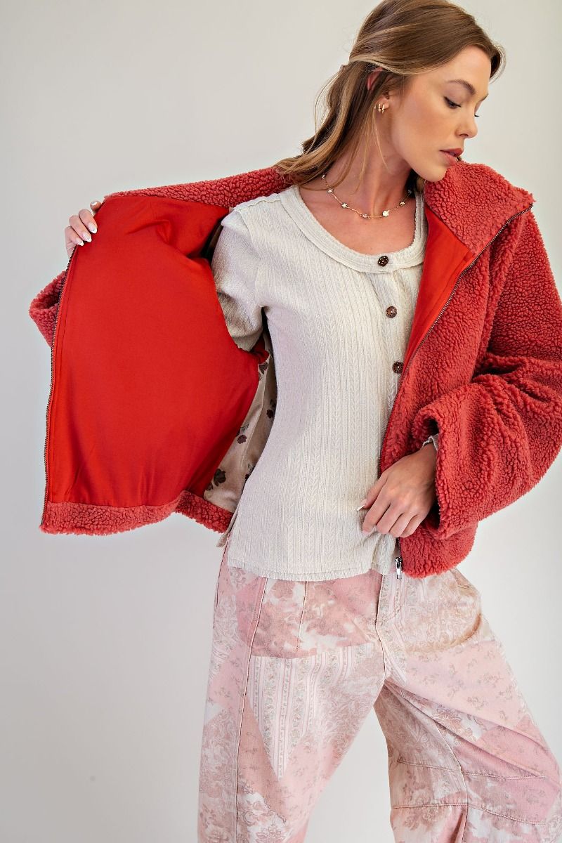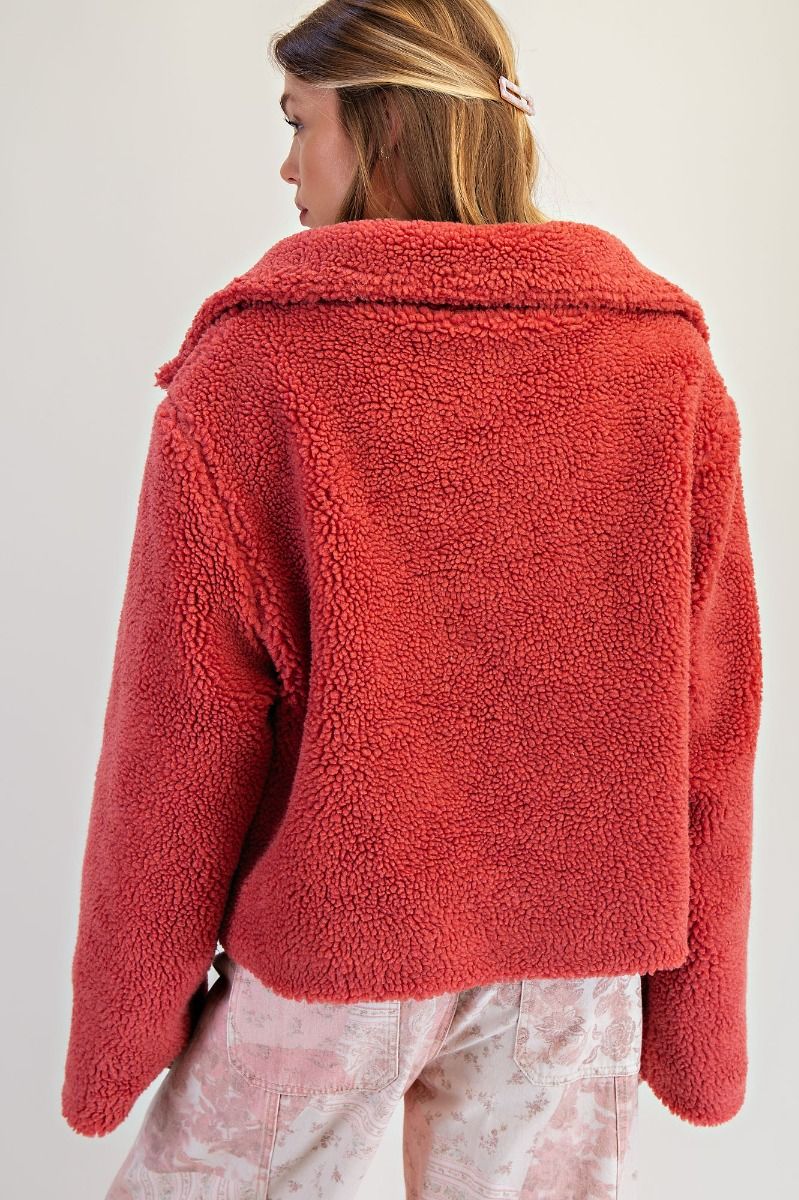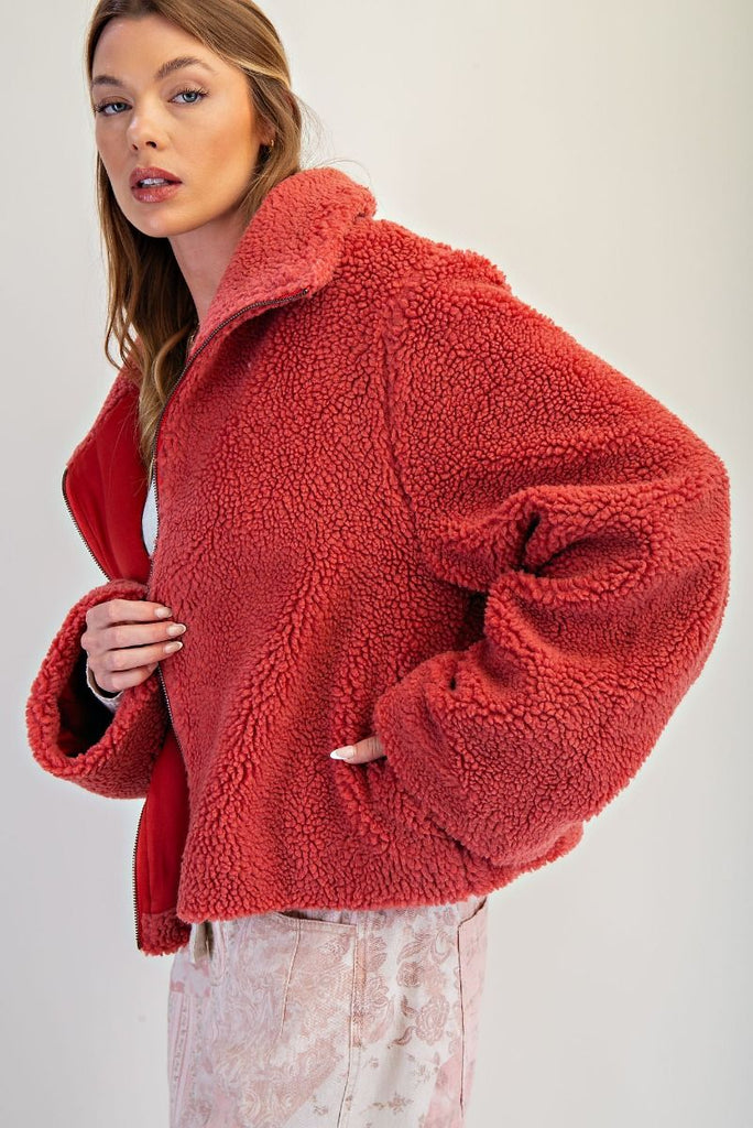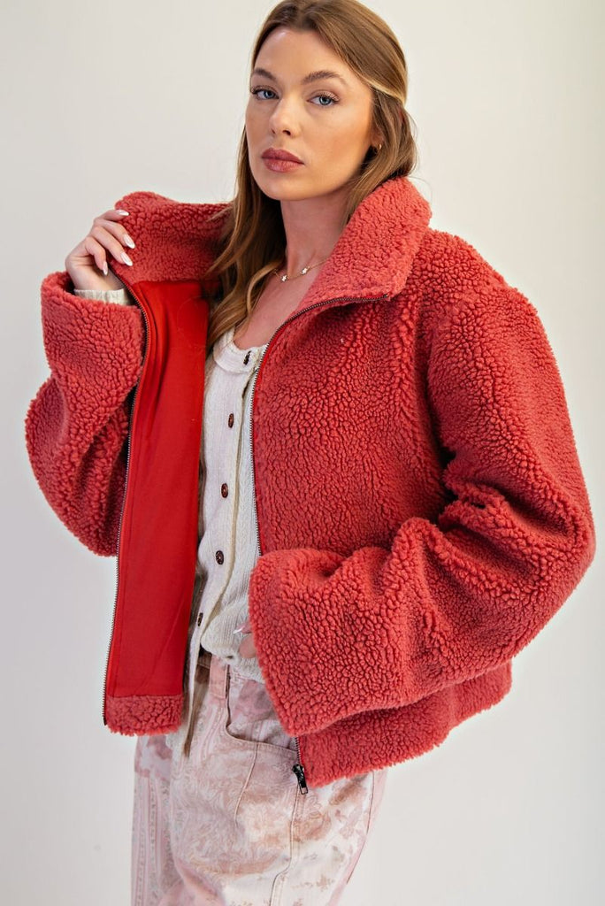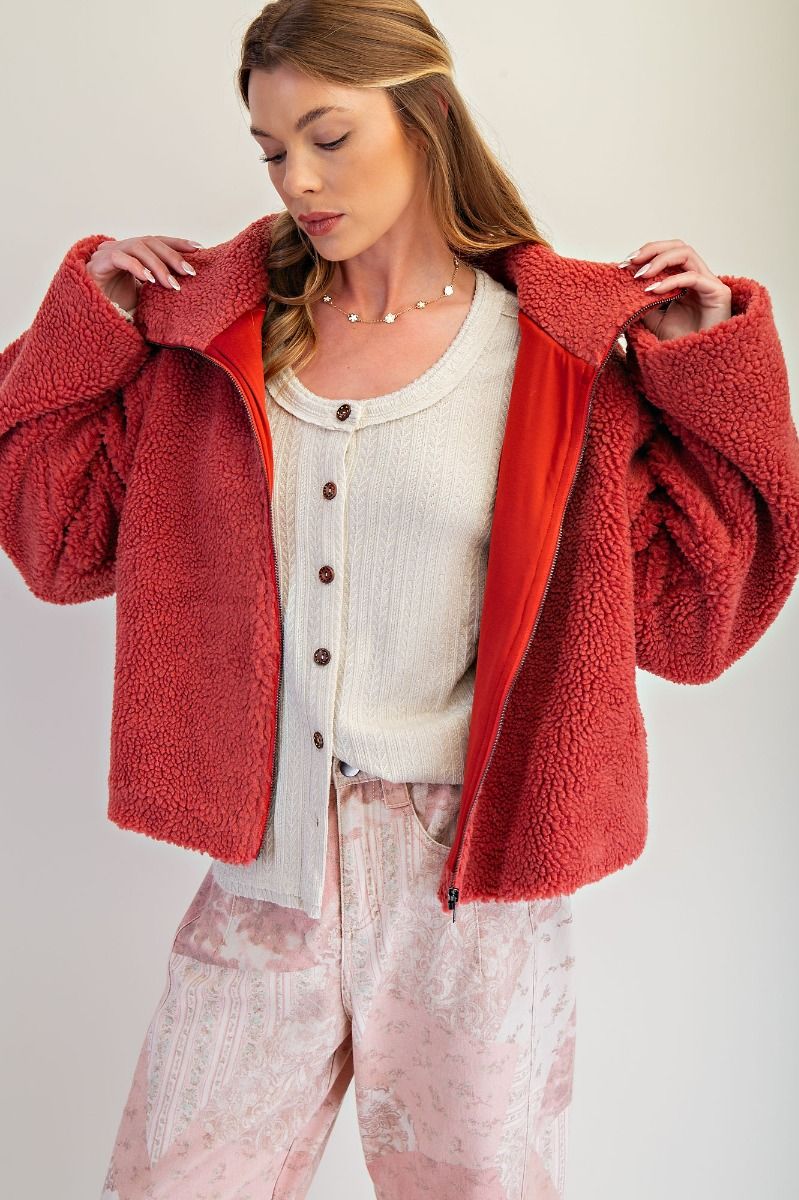 Wrap yourself in cozy comfort with this oversized sherpa zip-up jacket that's basically a teddy bear you can wear. Featuring dropped shoulders, wide long sleeves, and a relaxed silhouette, it's designed for maximum snuggle factor. The mock neckline and front pockets add practical charm, while the generous fit makes it perfect for layering or lounging. Small: 23" length, 23" bust, 24.75" sleeves. Your new favorite piece for staying warm and looking effortlessly cool.
