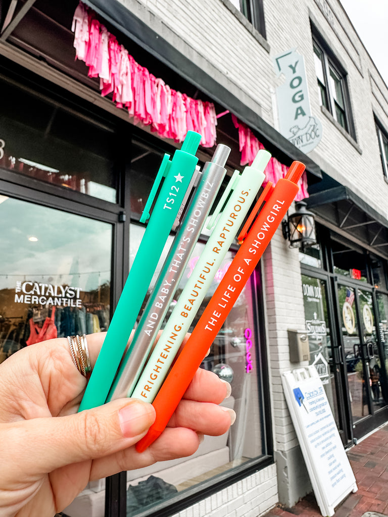 Channel Taylor Swift herself while writing with our Showgirl Pen Set for all the swifts. Pens Say: The Life of a Showgirl, Frightening. Beautiful. Rapturous., TS12*, And Baby, That's Showbiz.