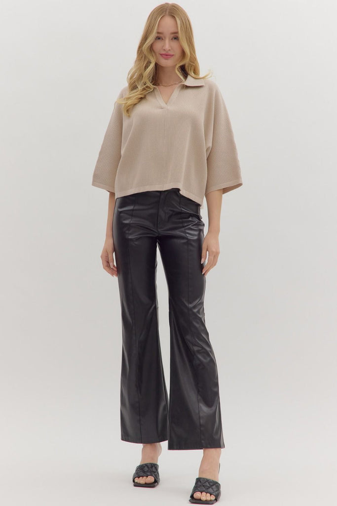 This playful 3/4 sleeve knit top brings effortless charm with its open V-neck collar and boxy silhouette. Crafted from medium-weight, non-sheer knit fabric, it offers comfortable coverage without lining. Perfect for adding a little fun to your everyday look while keeping things cool and cozy.