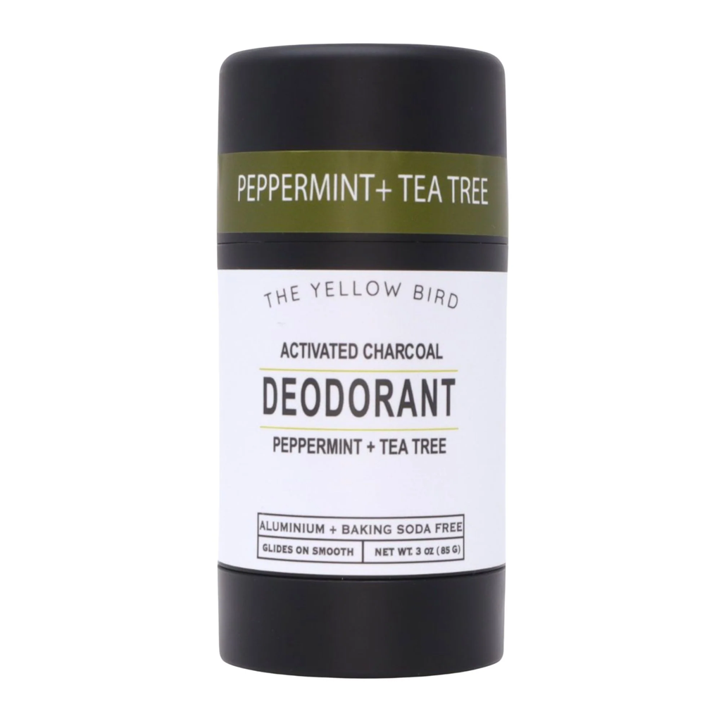Peppermint Tea Tree: Fractionated Coconut Oil, Stearyl Alcohol, Arrowroot Powder, Magnesium Hydroxide, Zinc Ricinoleate, Peppermint Essential Oil, Tea Tree Essential Oil, Organic Coconut Oil, Organic Shea butter, Jojoba Esters, Activated Charcoal