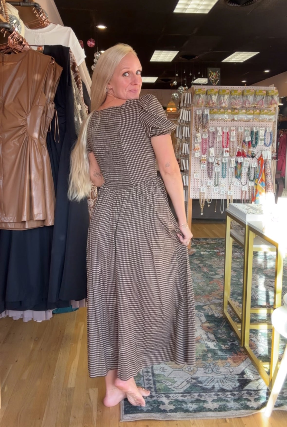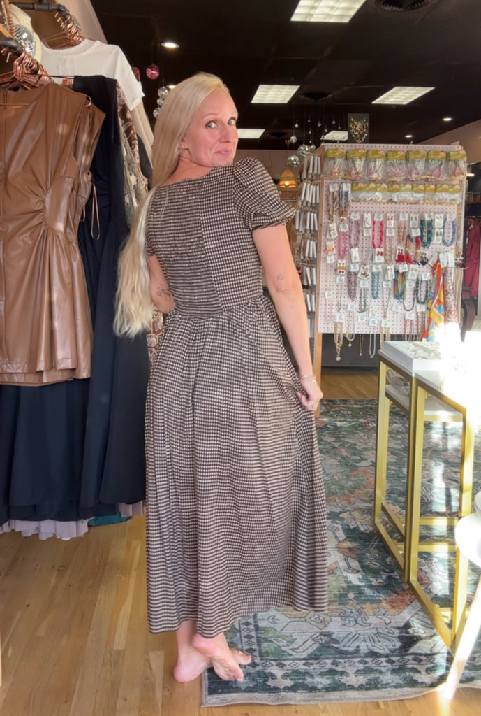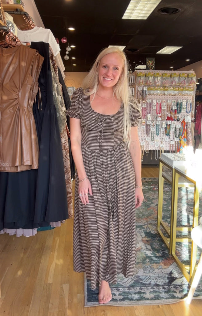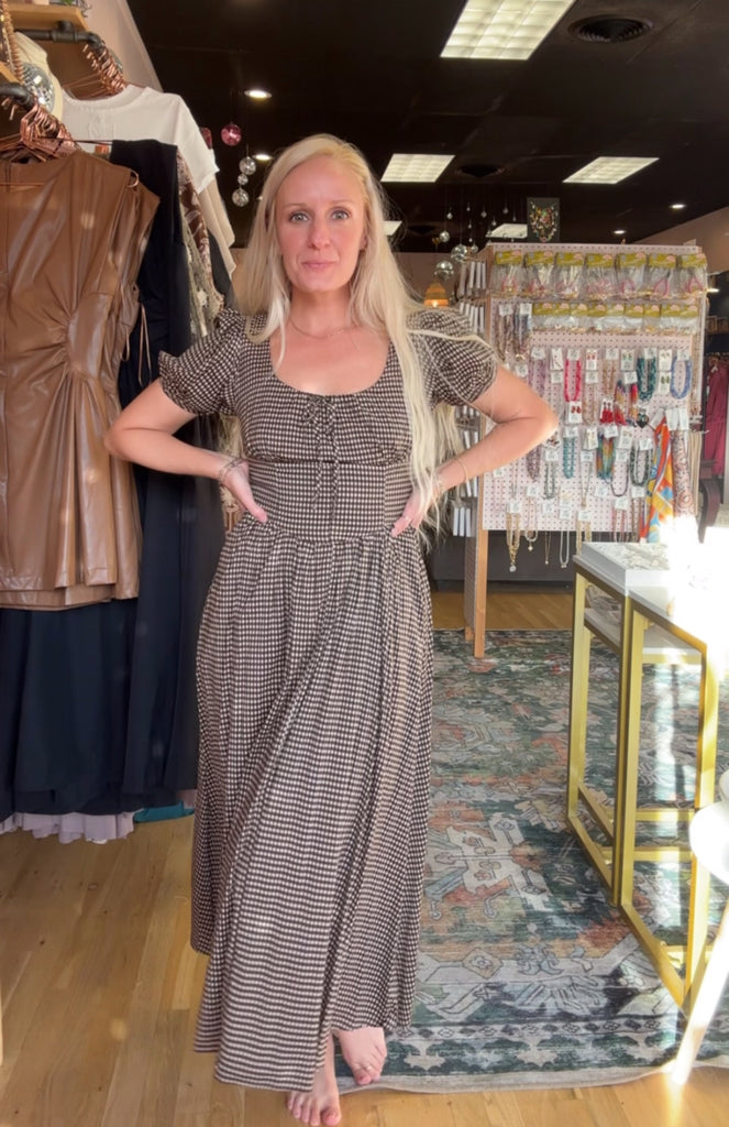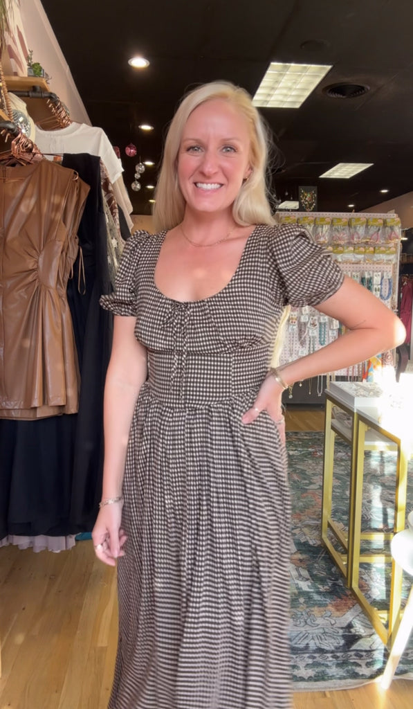 Step into charm with the A Tisket A Tasket Brown Checked Dress. This playful maxi-length dress features a classic brown checked pattern and flattering cap sleeves. The corset-style bodice shapes your silhouette, while smocking in the back ensures a comfy fit that moves with you. Perfect for days when you want a little vintage flair with effortless ease.