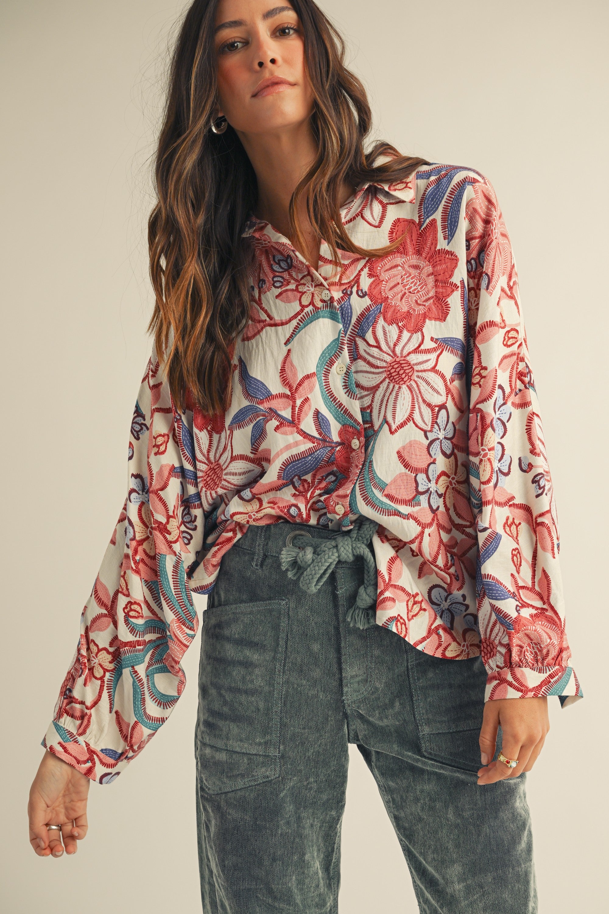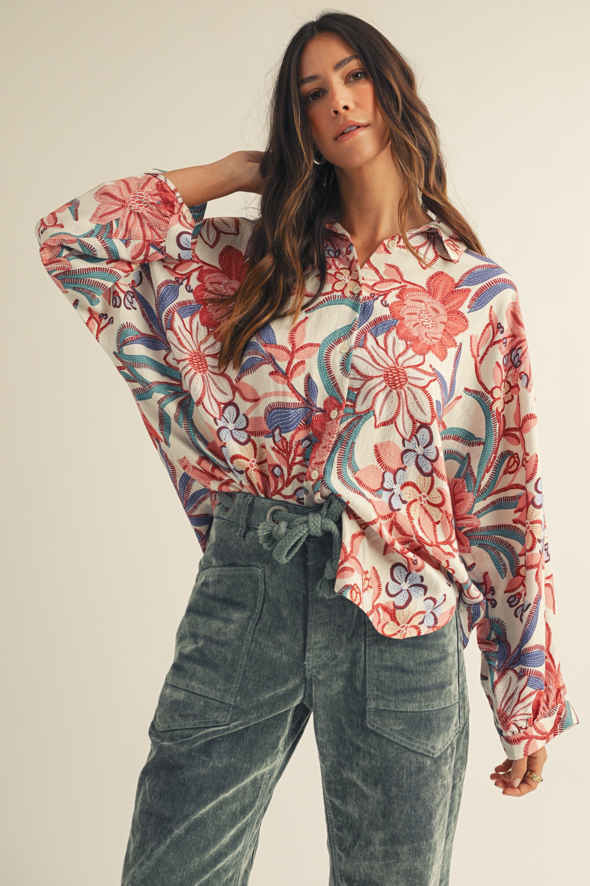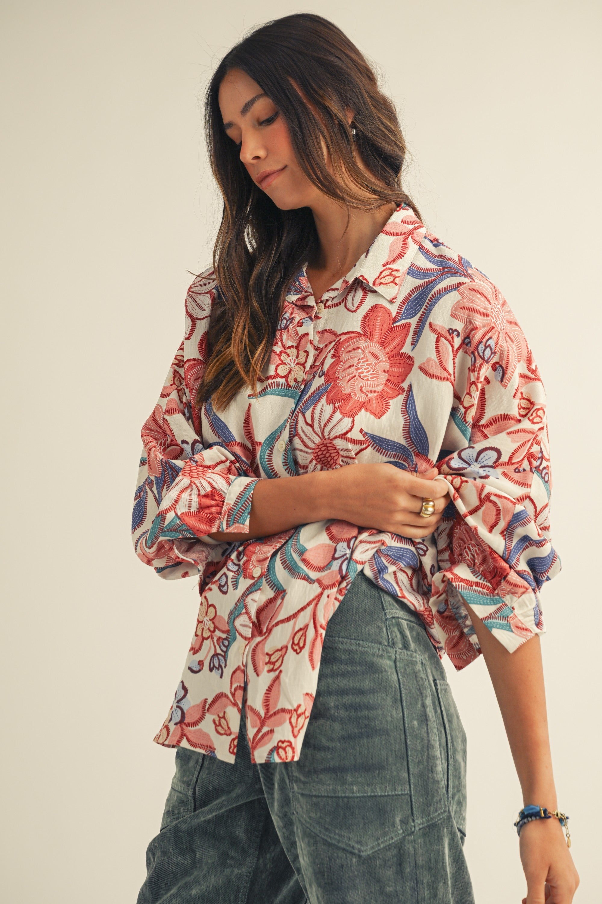 Slip into effortless style with this relaxed button-down shirt featuring a charming floral print and a playful feather design. The dolman sleeves offer a breezy, comfortable fit that moves with you, while the classic collar keeps things polished. Perfect for layering or wearing solo, this piece brings a touch of whimsy to your everyday wardrobe. Whether you're heading to brunch or a casual weekend adventure, the Royal Relaxed delivers comfort without compromising on personality.