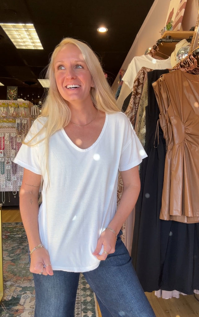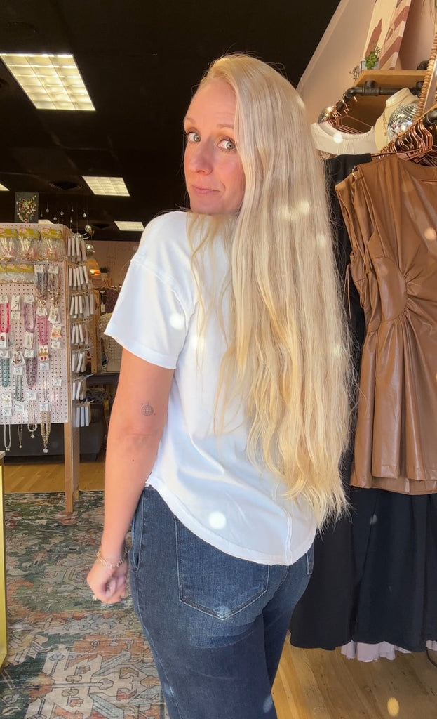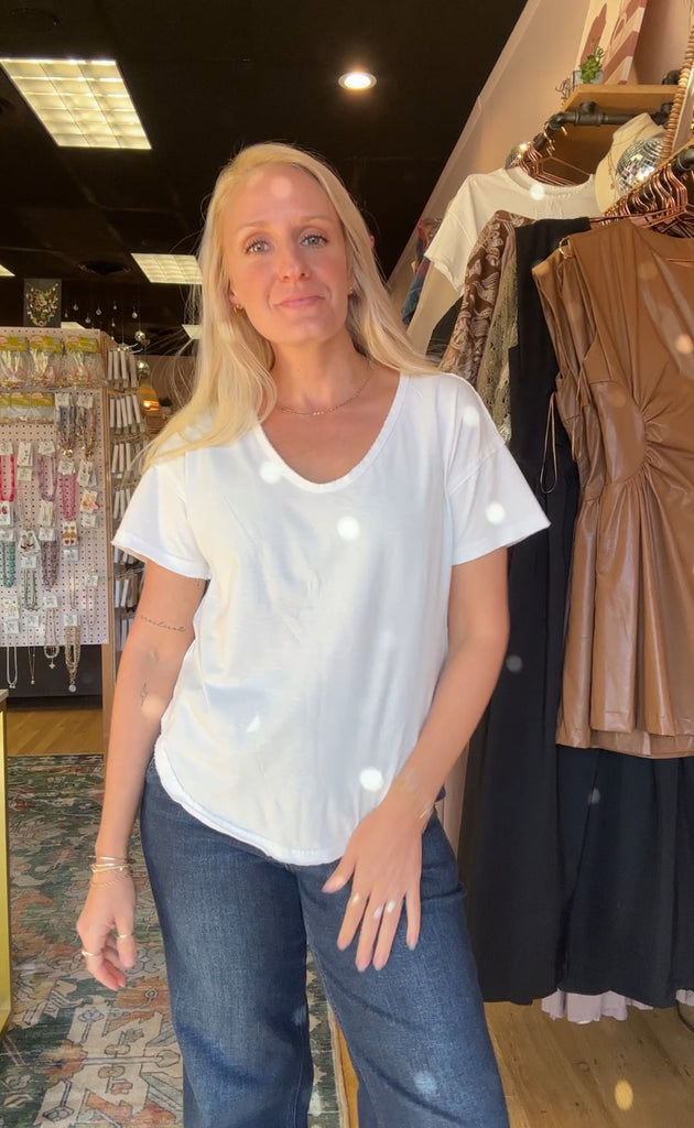 Enjoy effortless style with the White Cropped Swing Tee, crafted from soft cotton that feels like a dream. Its scoop neck and playful dolphin hem add fun flair, while the perfect cropped length makes it ideal for pairing with high-waisted favorites. Seam details bring subtle texture, making this tee as charming as it is comfy.